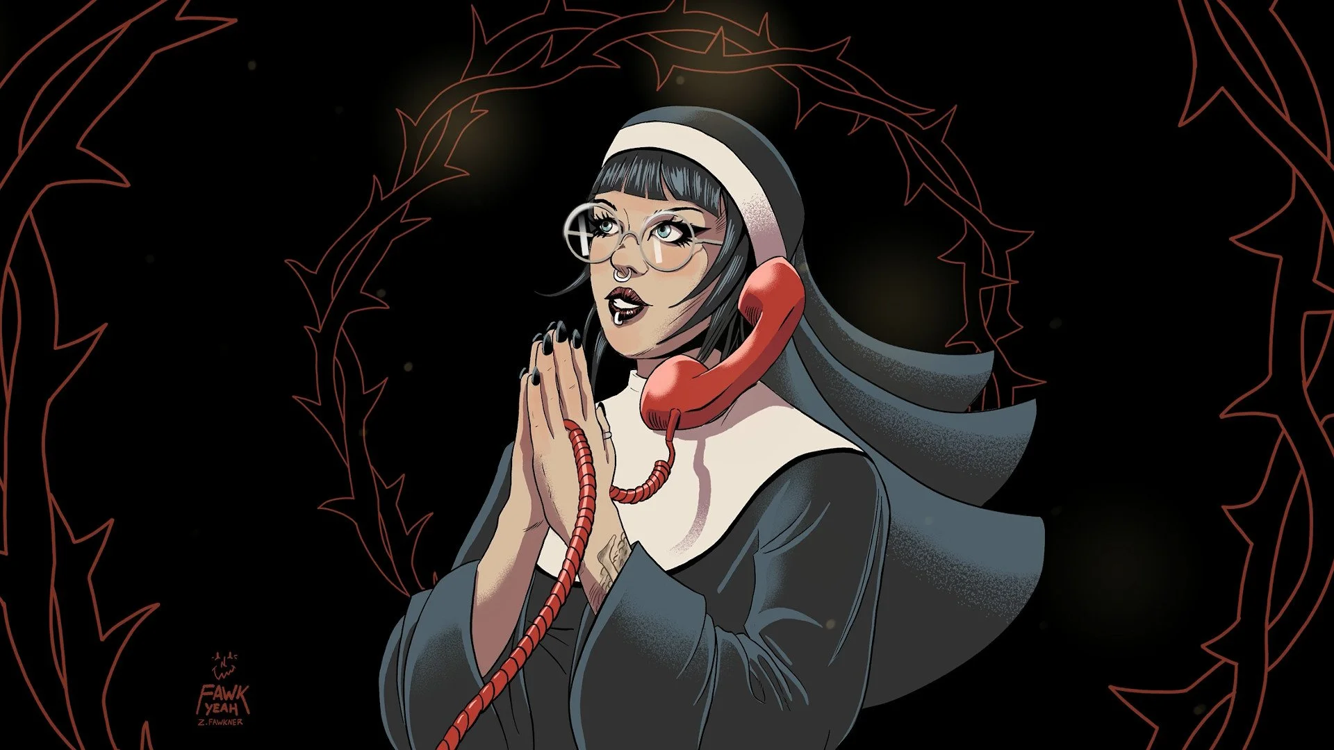 This illustration was also lightly animated with a swinging phone cord, moving habit, and rotating thorns.